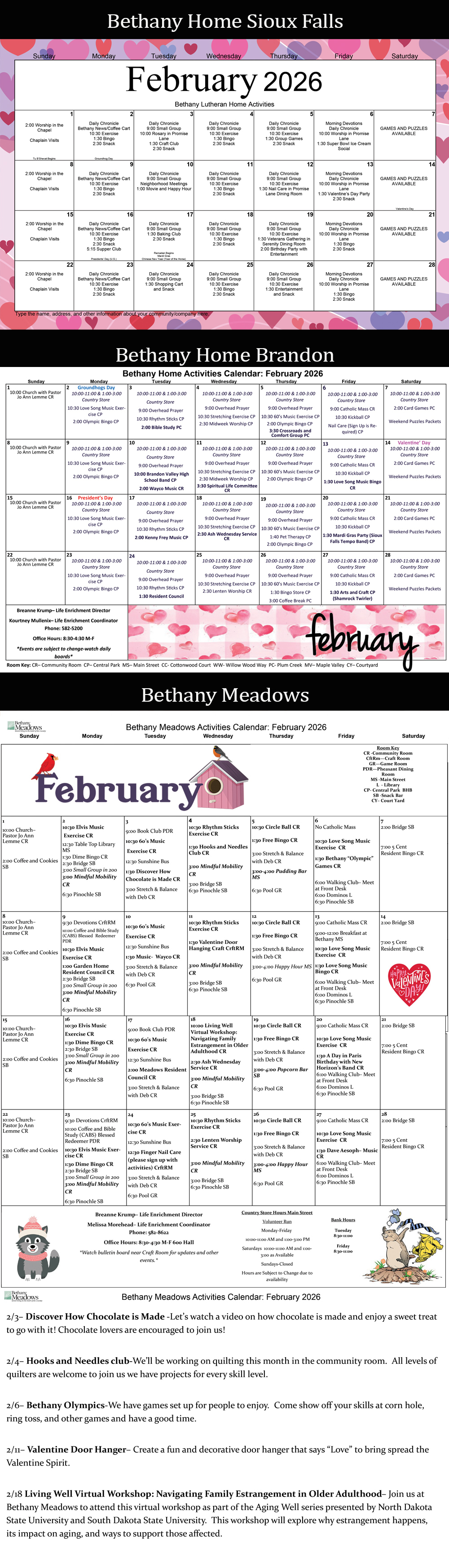 Schedule of Activities for Bethany Home - Assisted Living in Sioux Falls.