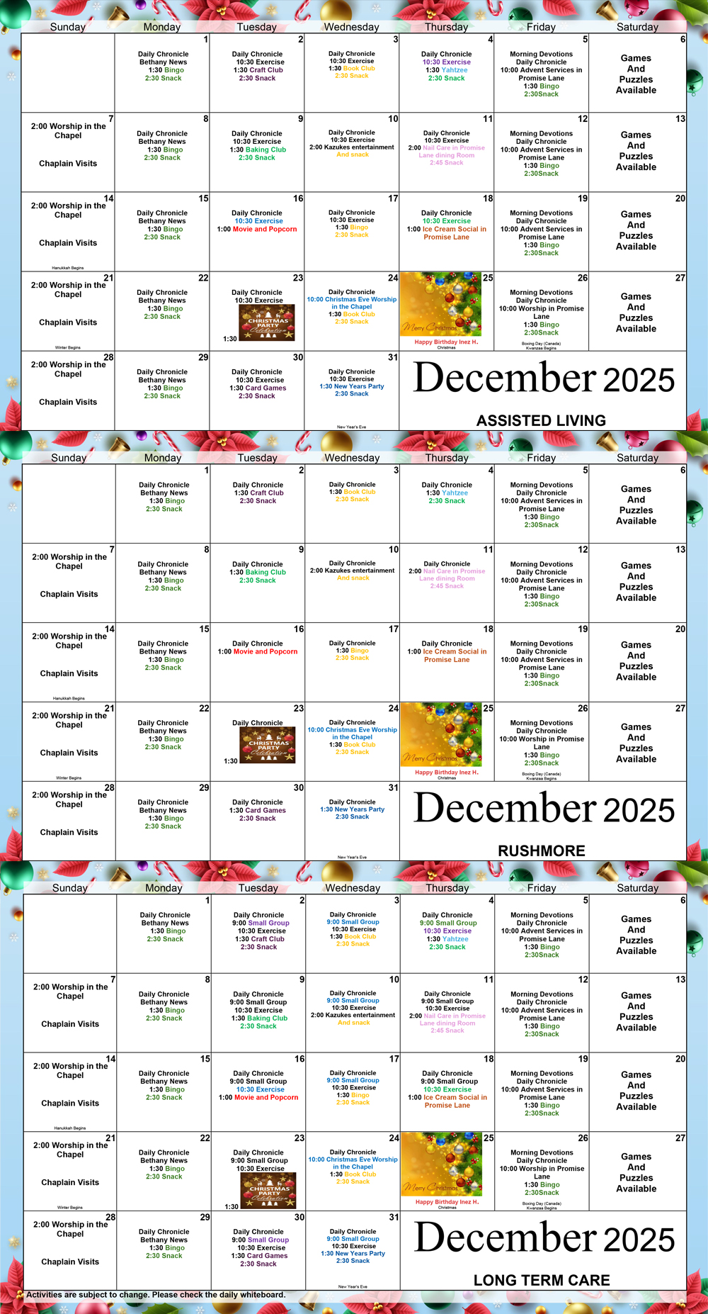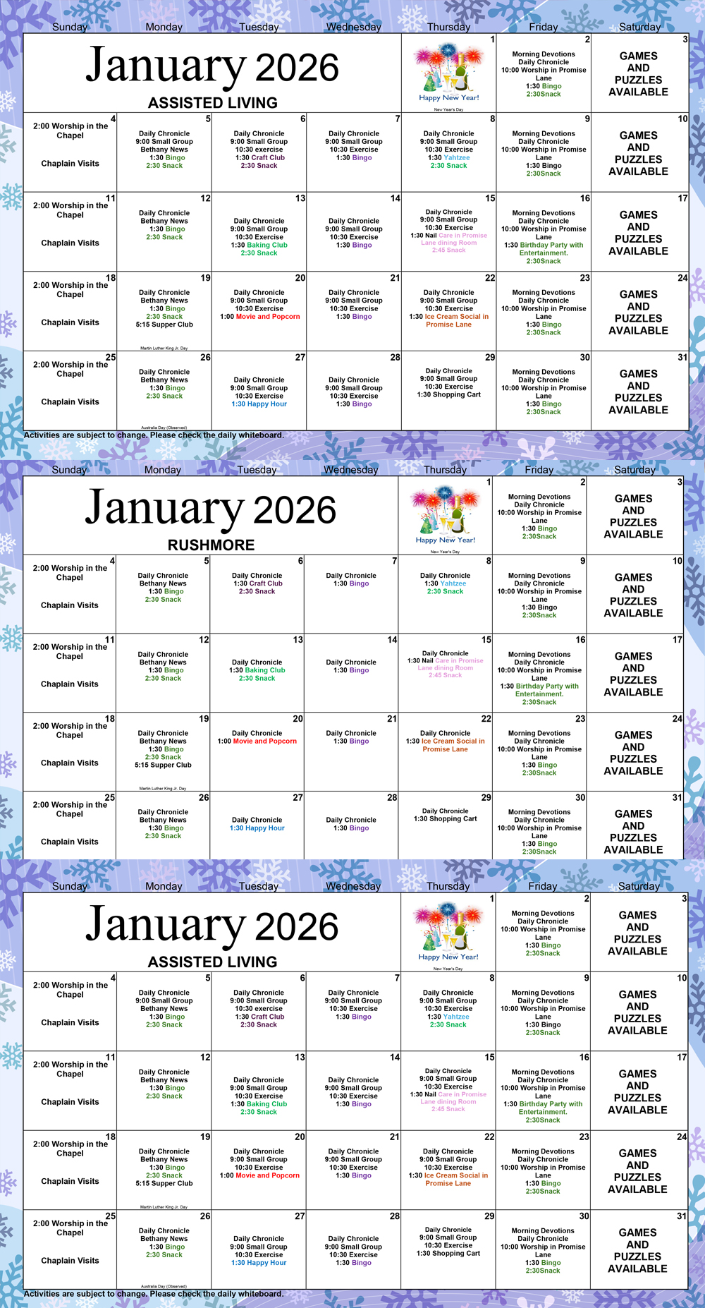 Schedule of Activities for Bethany Home - Assisted Living in Sioux Falls.