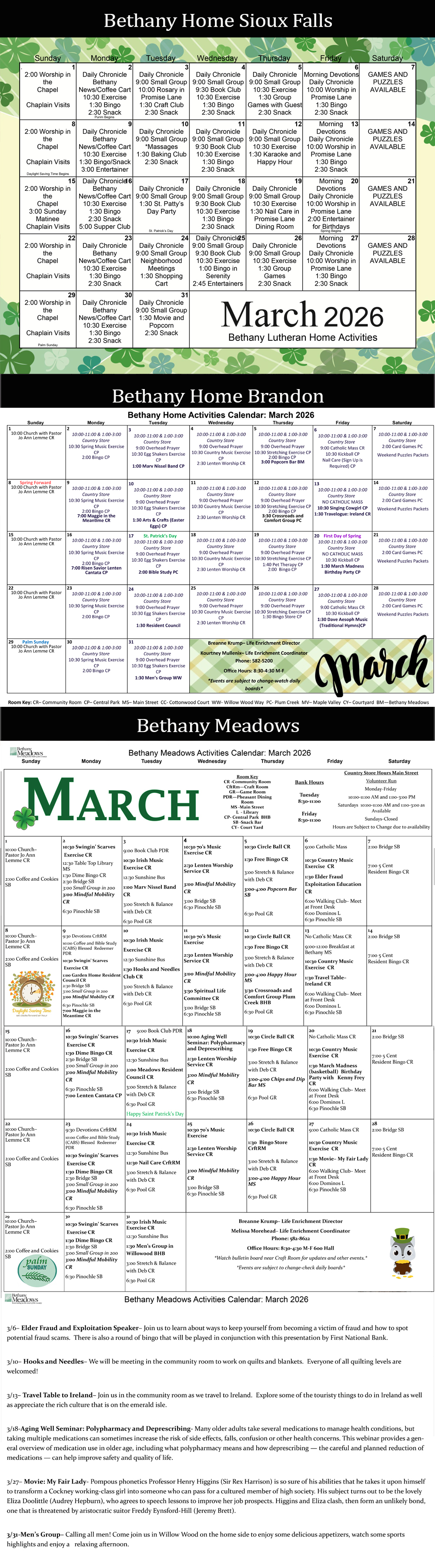 Schedule of Activities for Bethany Home - Assisted Living in Sioux Falls.