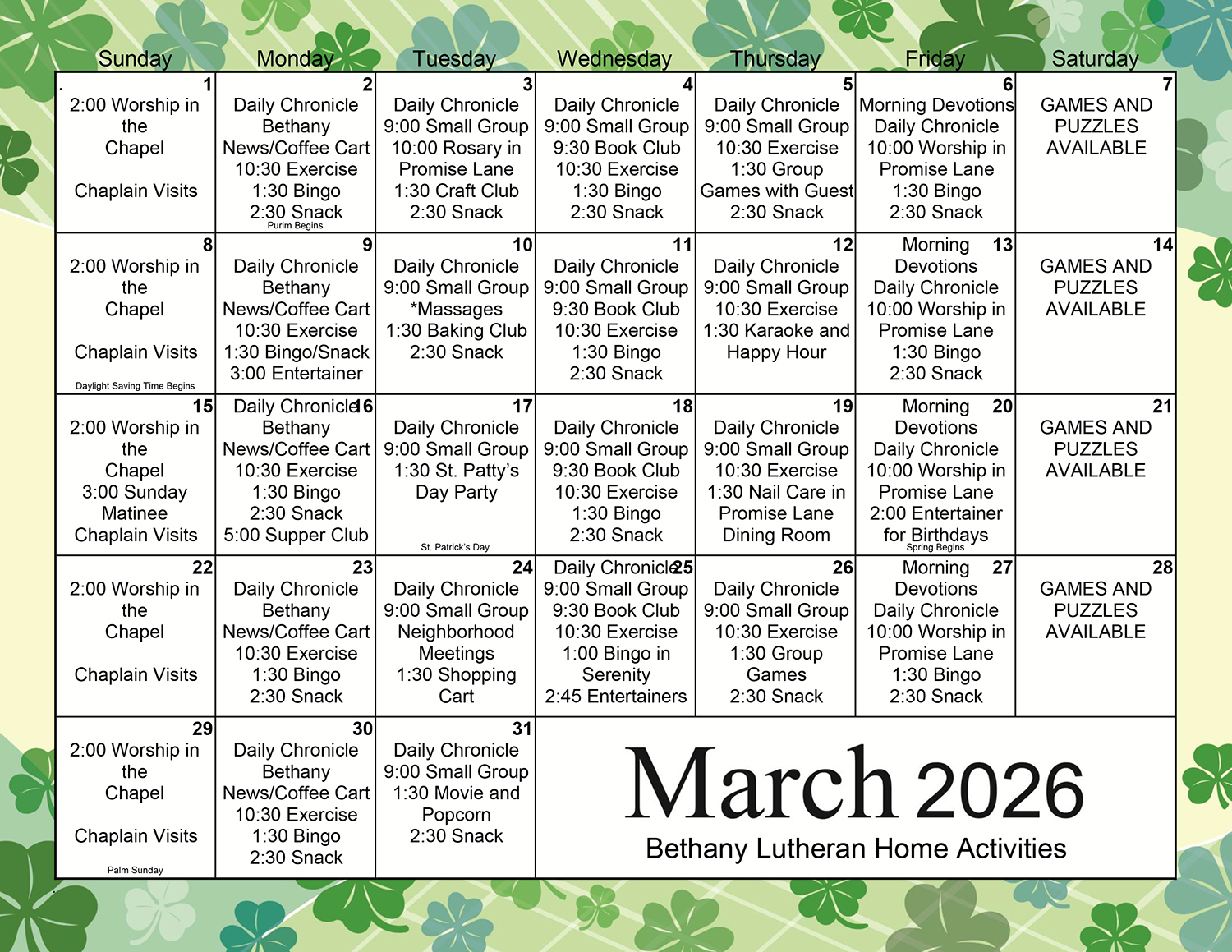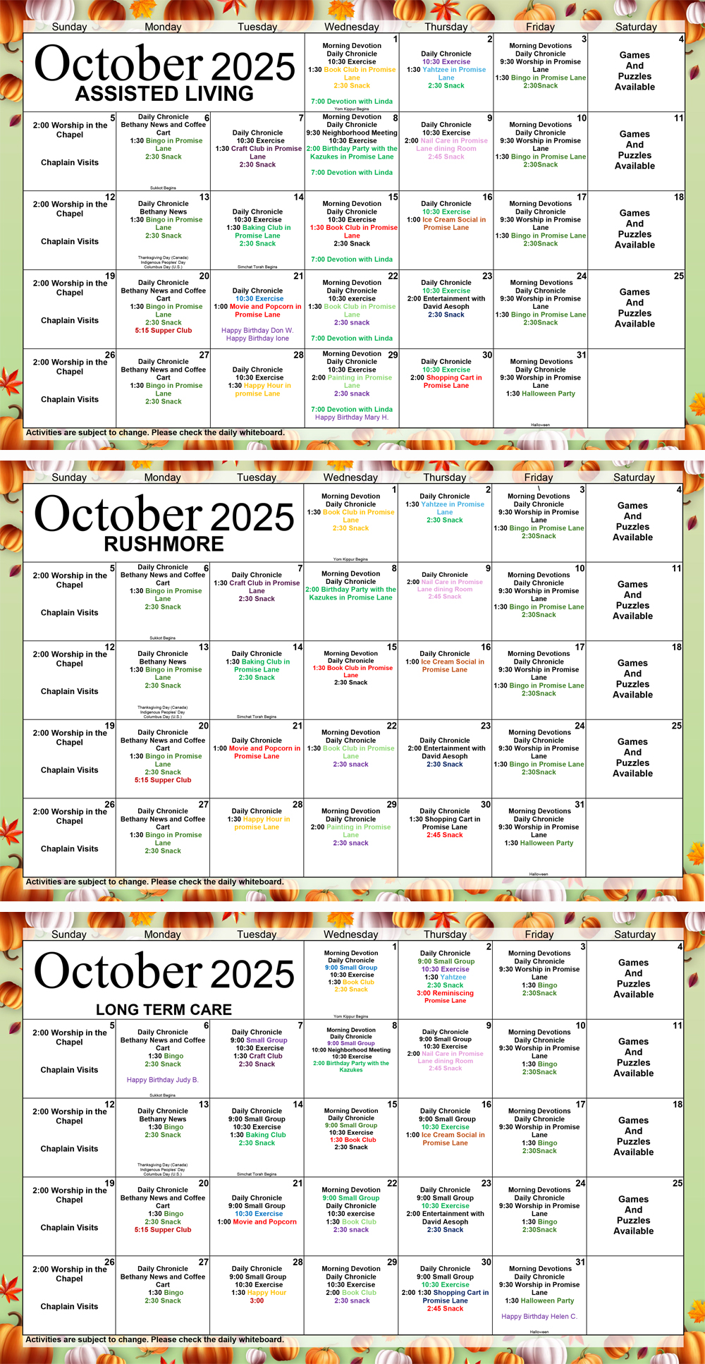 Schedule of Activities for Bethany Home - Assisted Living in Sioux Falls.